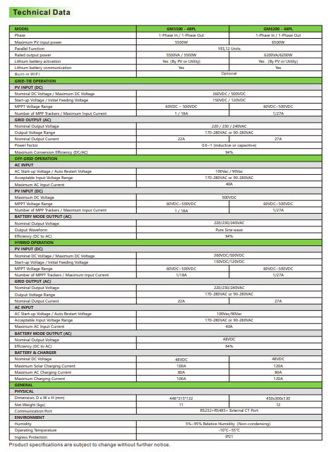 The hybrid nature of the GM Series allows for intelligent power management by combining the benefits of both grid-tied and off-grid systems. The system prioritizes solar energy first, then switches to battery power, and finally to grid power as a last resort. This reduces electricity bills, optimizes battery life, and ensures energy availability during outages. The system can also be programmed to operate based on time-of-use tariffs, battery charging preferences, or specific load demands, offering greater flexibility and efficiency.