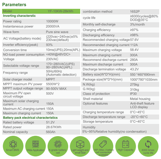 Equipped with grade A lithium iron phosphate (LiFePO4) batteries, the YF-10KW system can provide continuous power for essential appliances including air conditioners, refrigerators, lights, routers, washing machines, and even EV chargers. The 28kWh capacity is ideal for powering a 3–5 bedroom home for a full day or more, making it an excellent choice for off-grid cabins, RVs, remote businesses, or backup for critical medical and IT systems.